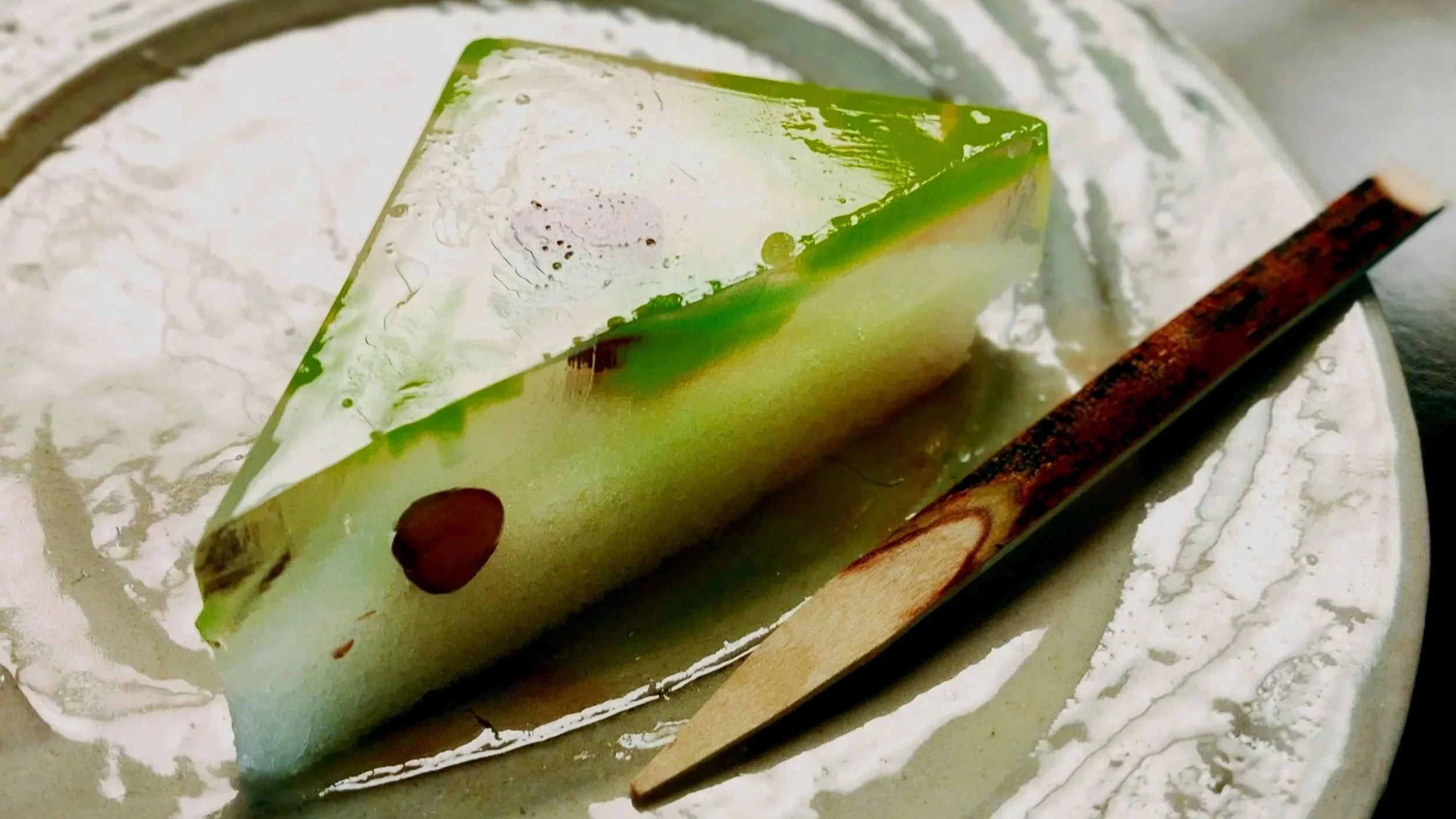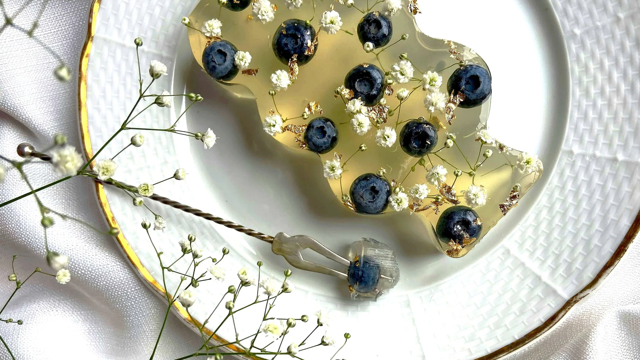 Clear, jewel-like gels that frame fresh herbs, flowers, or charred vegetables.